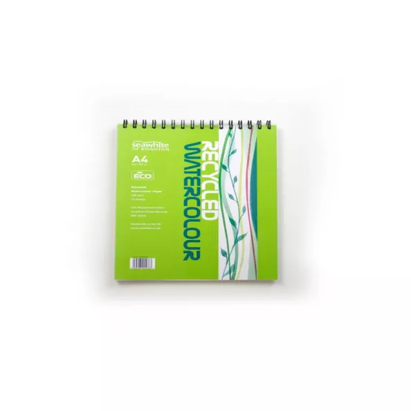 A4 Landscape Spiral Watercolour Pad 15 sheets of Seawhite 350gsm NOT finish watercolour paper White heavyweight paper with medium surface texture Requires no stretching 2mm greyboard backing Green design card cover Spiral binding on the short edge