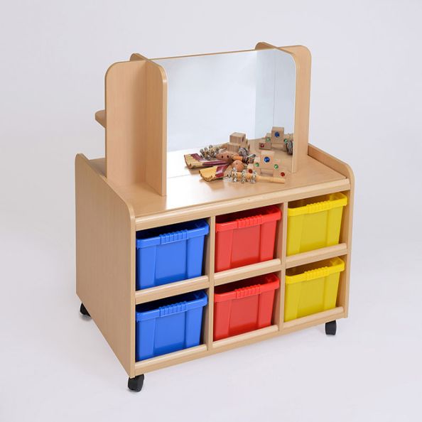 • Uniquely designed double sided units • Made from 18mm Beech Faced MFC with ABS Edging • The top of the units can be used as a Play Table • Solid beech frames surrounding the tops prevent items from rolling off onto the floor • One side has opening doors, or trays, reverse is open storage • Supplied flat pack with trays as shown • Dimensions W940 x D610mm. Accessories not included.