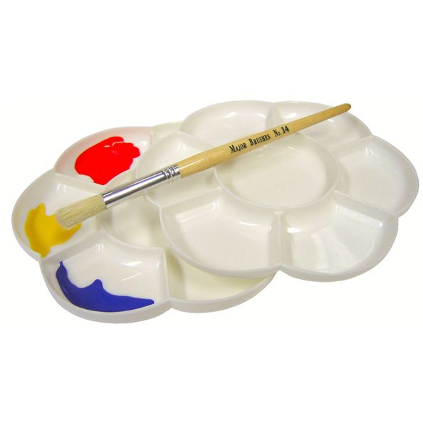 Set of 2 flower shaped palettes with 6 compartments loosely fitting together. 17.5cm diameter. Suitable for storage of small items and the two parts can be held together with a rubber band for overnight storage of non liquid materials