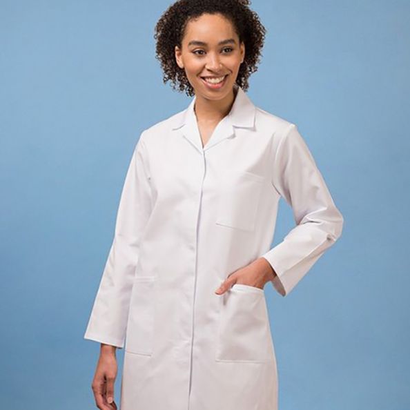 Ladies polyester cotton lab coat. 100cm chest size. White polyester/cotton laboratory coats for men and women, with two side and one top pocket and concealed stud front fasteners.