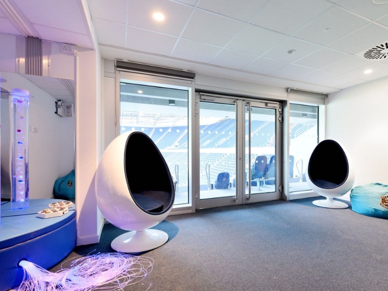 The Sensory Box is a pitch-facing quiet space designed to allow supporters with sensory needs to actively enjoy the live matchday experience in a calm and supportive environment. Equipped with specialist sensory equipment, the space carefully balances sensory regulation with clear sightlines to the pitch.