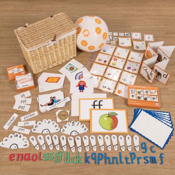 This kit provides a range of resources that will help children extend their phonics learning through fun, engaging activities. All resources provided in a sturdy, wicker basket.1 x set of 44 sounds stickers Transparent pockets wall chart with 2 object cards per pocket and 48 object pieces 18 x phoneme fans 1 x set of 23 A4 double sided mnemonic flashcards 1 x phoneme frieze 1 x buried treasure activity 1 x decodable and tricky