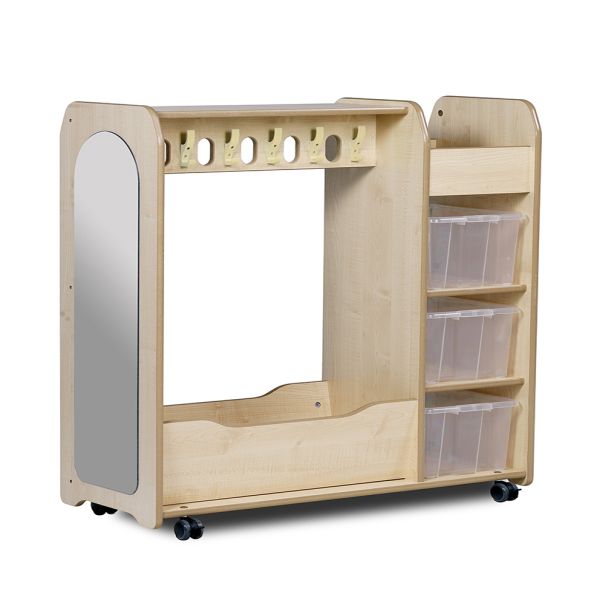 Charming double-sided dressing-up unit made from scratch-resistant maple melamine with lockable, anti-scratch castors. Excellent storage capacity for storing dressing-up clothes and accessories. • Suitable for 3 years+ • 6 coat hooks on each side • Full length safety mirror • Handy storage compartment on top of unit • Storage area in base of trolley • Supplied with 3 clear tubs for visible storage • Lockable castors are anti-scratch and low-noise • Manufactured in the UK • Fully assembled • 5 year guarantee W1000 x D400 x H1100mm