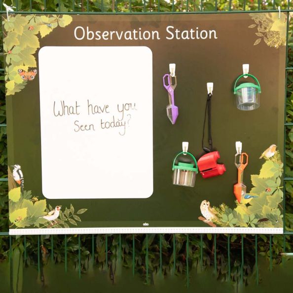 Enable children to explore the world around them, whilst at play. This playground signboard features hooks for you to display observation and science equipment, encouraging children in self-led investigations.
