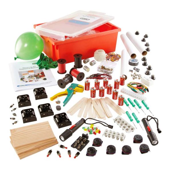 Packed in a colour-coded tray, the kit includes: batteries, battery holders, bulb holders, buzzers, bulbs, wire, wire strippers and much more. With a booklet full of worksheets, pupils will develop an understanding of how electricity can be used and its dangers and benefits to us. The 14 suggested experiments will help pupils gain an understanding of what electricity is and where it comes from.Insulated wire Wire stripper Small bulbs LED bulbs Battery holders Battery snap Batteries Crocodile leads Bulb holders Ball of string Assorted switches Buzzer Electric motor Motor pulley Screwdriver Insulating tape Wood block Variable resistor Balloons