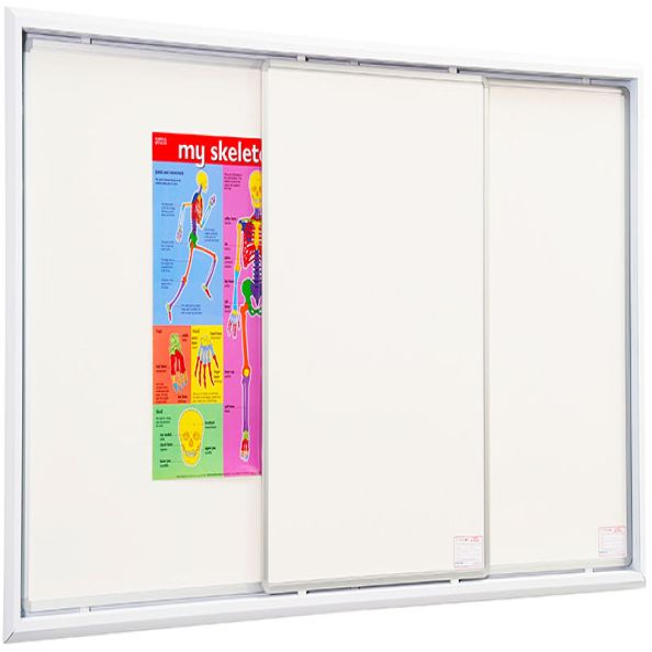 • Sliding writing board system with non-magnetic surface • Full back board with 1 or 2 sliding boards • System fitted with 3 channels so sliding boards can overlap • Nylon glides provide an easy sliding action • White anodised aluminium frame • Wall fixings included • 5 year surface guarantee 2400(w) X 1200mm(h)