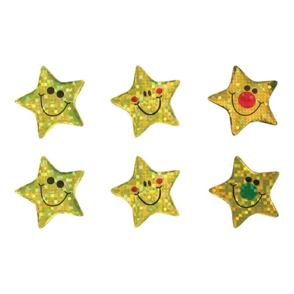 Star shaped smiley stickers with a sparkly gold effect.