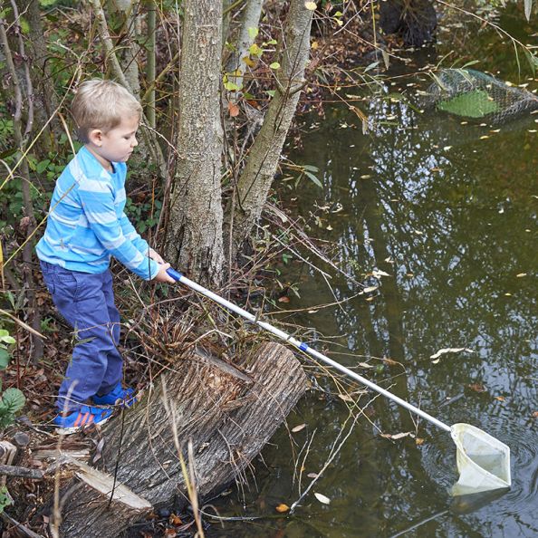 Handy pond net with telescopic aluminium handle and knotless fine mesh, will not harm specimens. Safe and durable. Guaranteed not to run if holed.