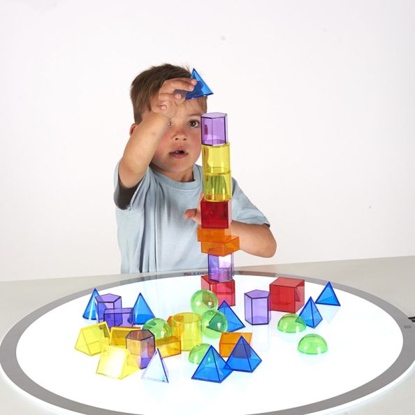 Set of small geometric solids in 12 different shapes and 6 colours. Ideal for learning shape names and attributes using a light panel. Comes in a convenient storage container.