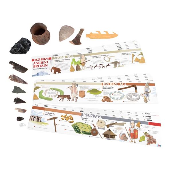 A fantastic tool for providing an artefact handling opportunity and a fun and engaging activity for the whole class. Encourage discussions about evidence, types of historical sources and much more! Handle flint objects with caution and care, adult supervision required. Contents may vary.1 x Fish Harpoon 1 x Mounted Axe 1 x Flint Hand Axe 1 x Small Crystal Quartz Arrowhead 2 x Small Arrowheads 1 x Medium Arrowhead 1 x Large Arrowhead 1 x Large Neolithic Knife 1 x Large Biface 1 x Axe Head 1 x Miniature Flint Dagger 1 x Rocket-shaped Borer/Stone Drill 1 x Clay Pot 1 x Stone to Iron Age Desktop Timelines 1 x 12ltr Storage Box